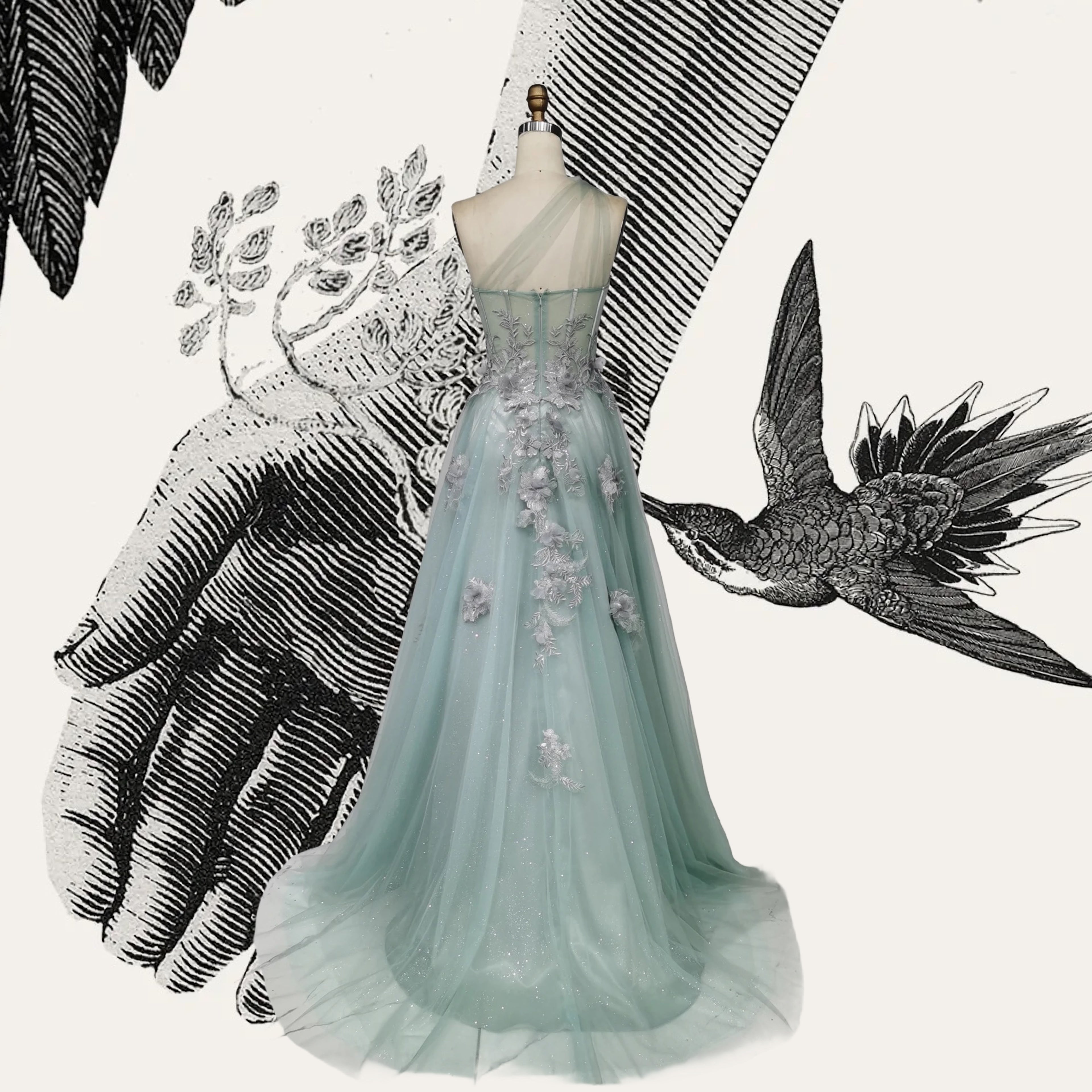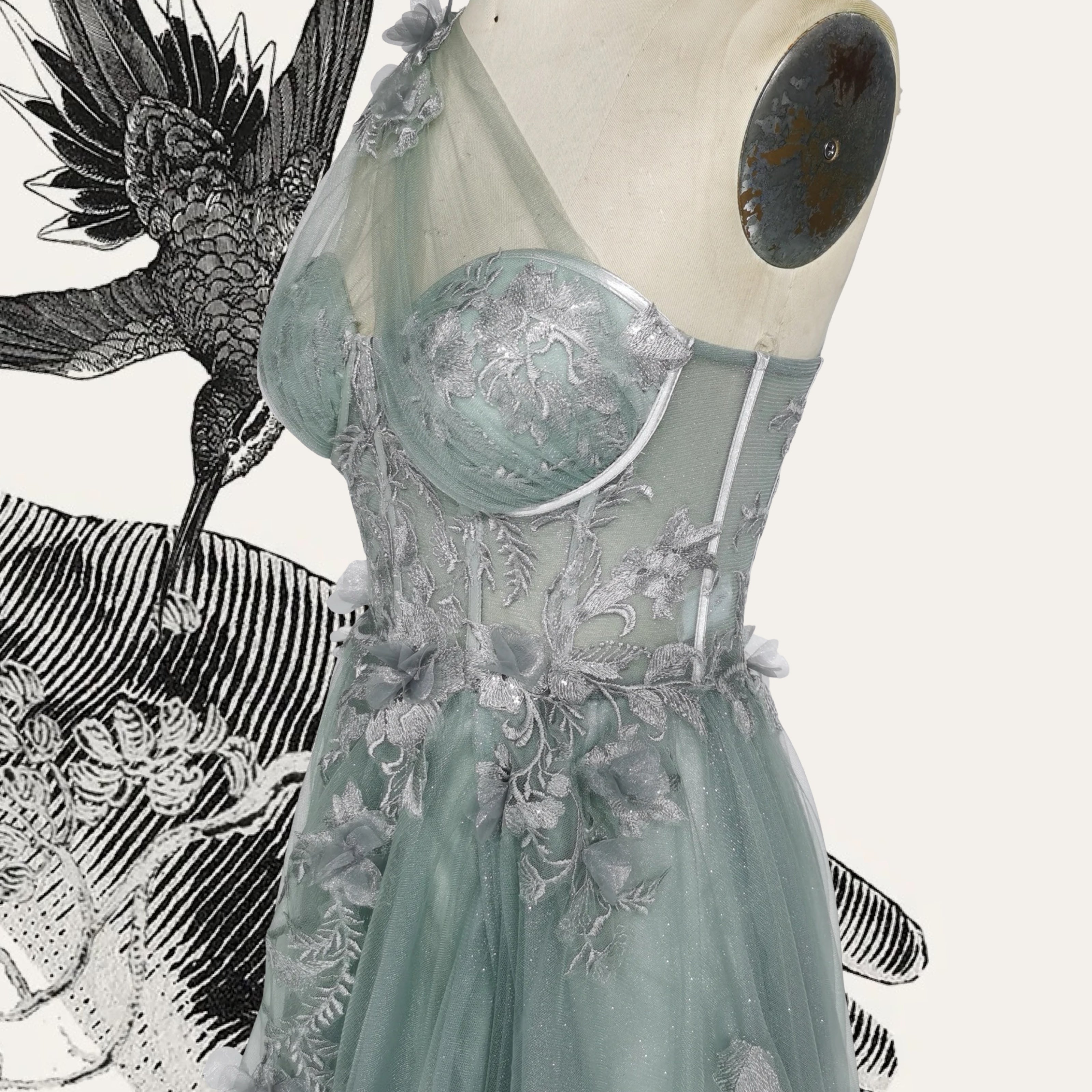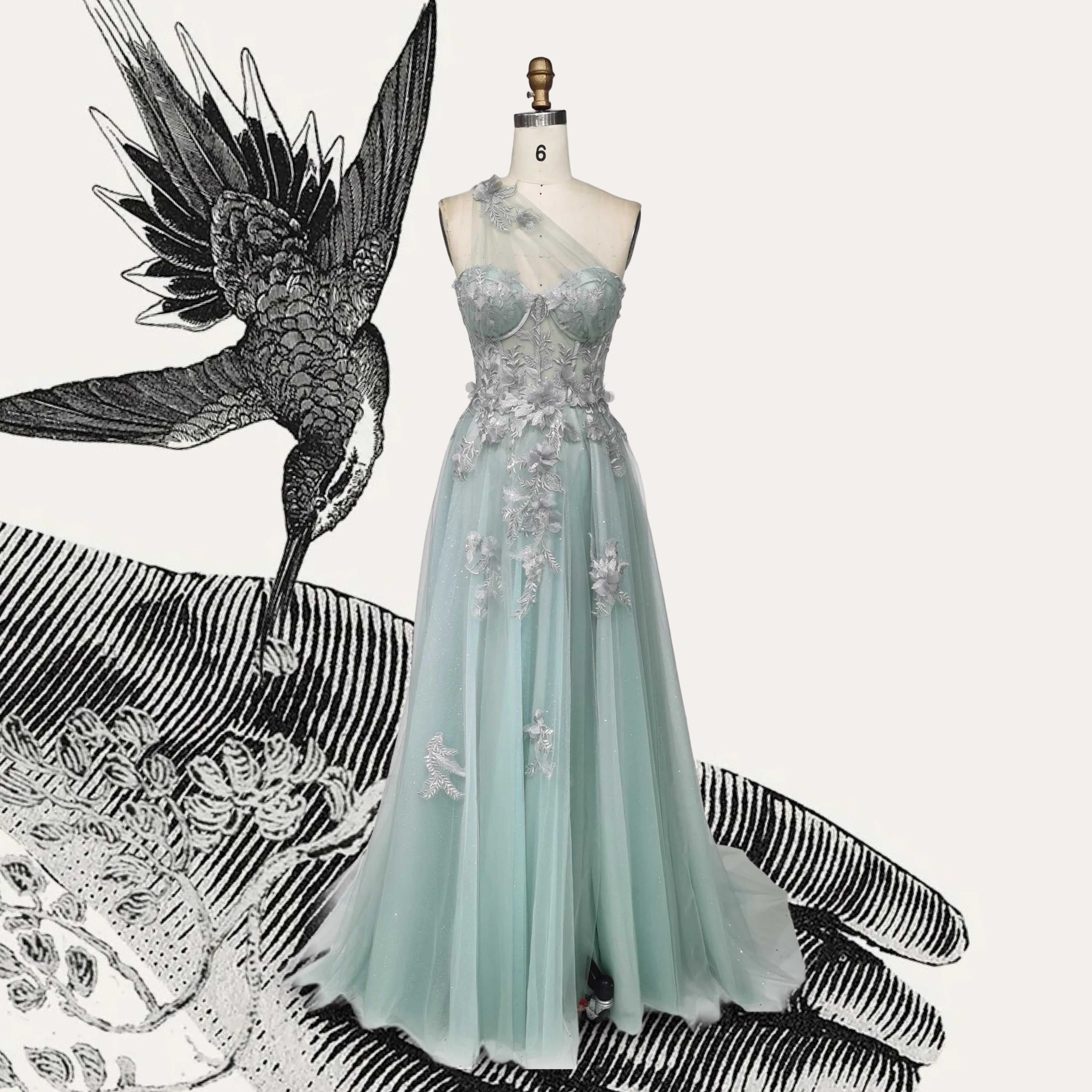 Light green wedding dress, bridesmaid dress or formal evening gown. Stunning vintage inspired green lace gown, engulfed in tulle and appliqué for a romantic event or wedding party. Elegant ball gown with asymmetric tile shoulder over sweetheart neckline a constricted bodice. Sheer lace, with snd option of body suit for a more modest look, (please enquire as we can provide these free of charge). Pink and black options also available. Fully lined A line skirt.