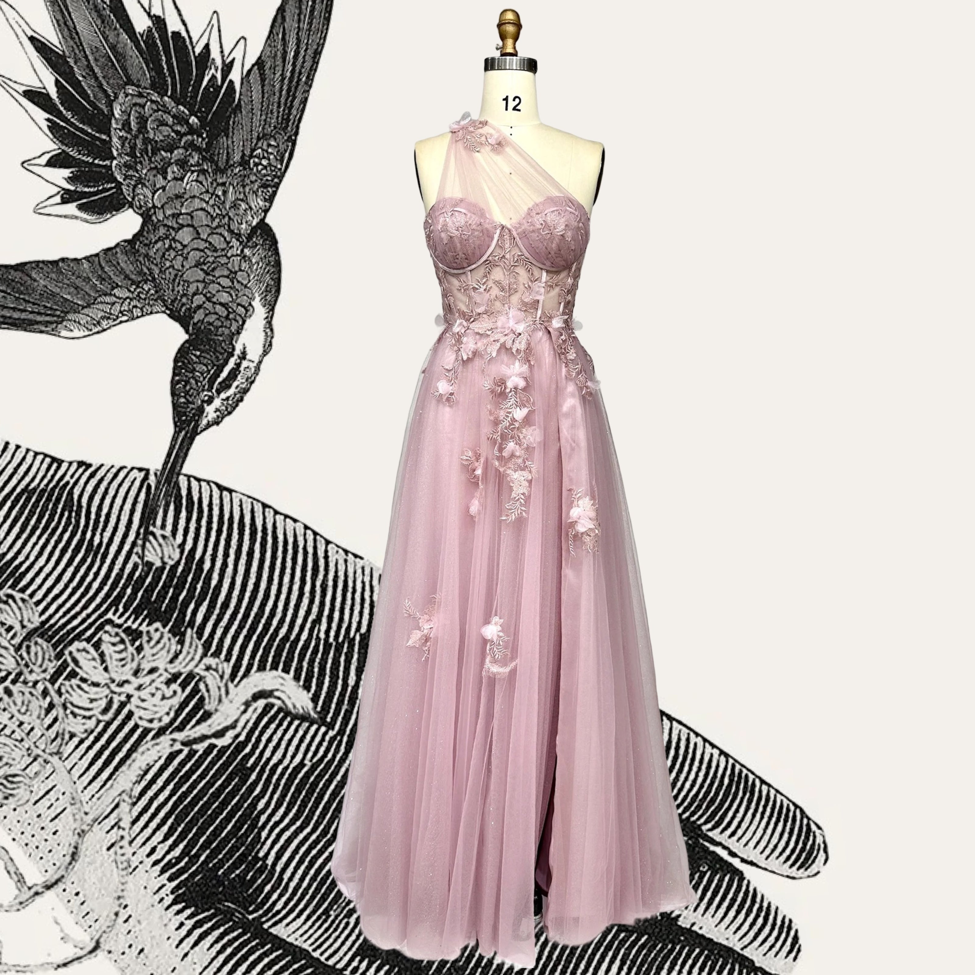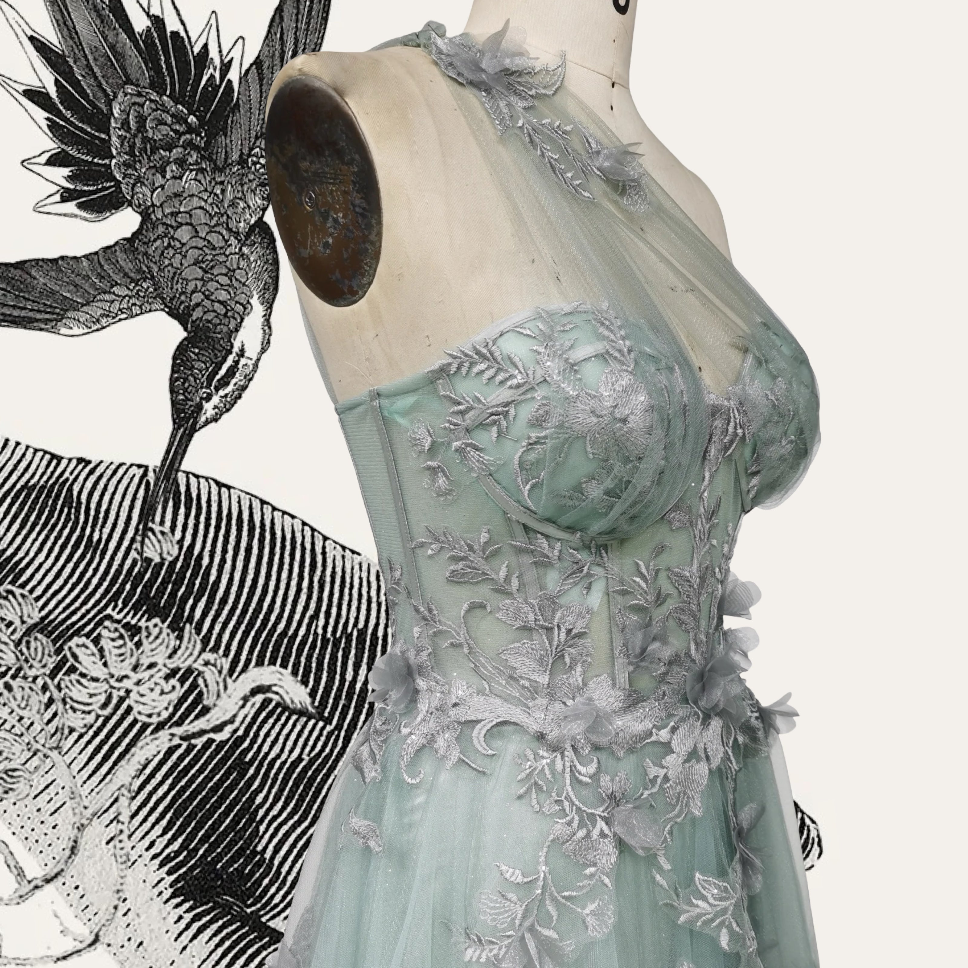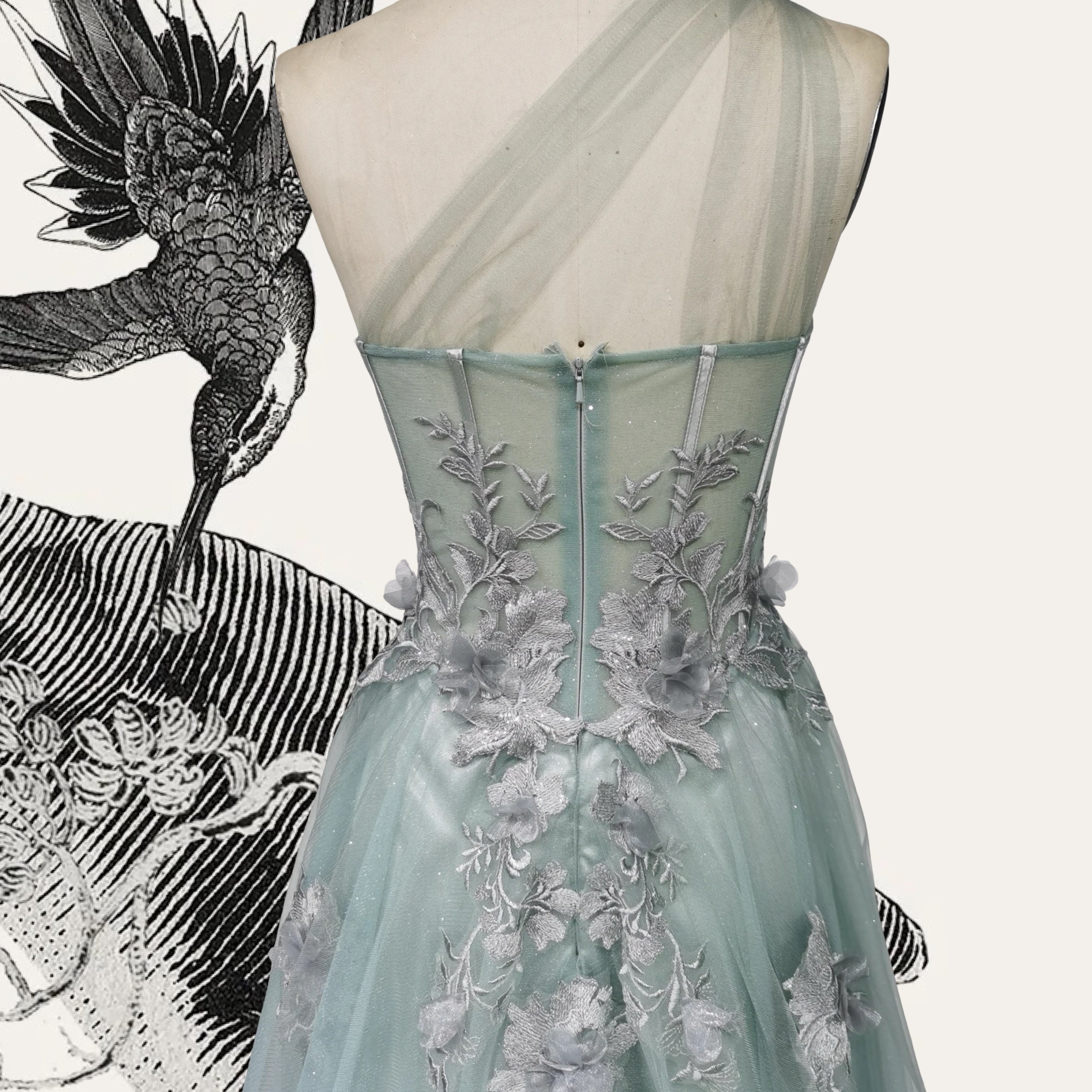 Light green wedding dress, bridesmaid dress or formal evening gown. Stunning vintage inspired green lace gown, engulfed in tulle and appliqué for a romantic event or wedding party. Elegant ball gown with asymmetric tile shoulder over sweetheart neckline a constricted bodice. Sheer lace, with snd option of body suit for a more modest look, (please enquire as we can provide these free of charge). Pink and black options also available. Fully lined A line skirt.